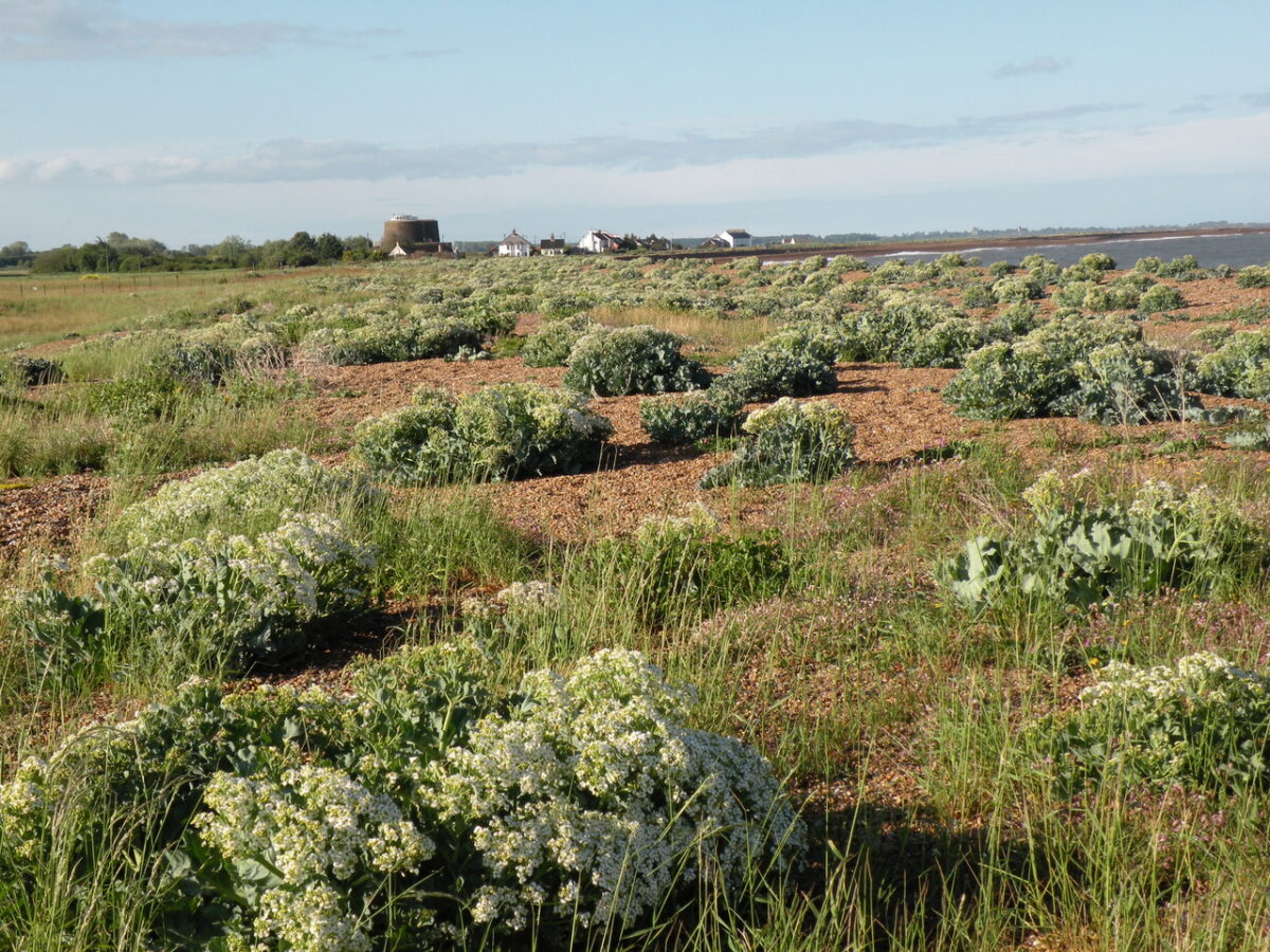 Shingle Street is famous for lurid stories about mysterious wartime fatalities on the beach, but we also had a better-documented one here last year. Our coastline is home to many rare and beautiful plants, none more striking than the Sea Kale that creates a wonderful swathe of foaming white blossoms on the shingle banks in early summer. Sea Kale is a kind of cabbage and when it emerges it looks for all the world as if the beach has suddenly sprouted gigantic cauliflowers everywhere. After Dungeness, this is one of the best places in Britain to witness this natural phenomenon. The Kale has to cope with an extreme environment, of course. It’s doused with salt spray, exposed to constant winds and parched by the sun; there’s no fresh water and almost no soil; while the shingle itself is unstable and constantly shifting. But the Sea Kale is specially adapted to cope with these testing conditions. It has very deep roots (up to two metres long) to suck up moisture and pale fleshy leaves to reduce water loss. The plant’s a survivor.